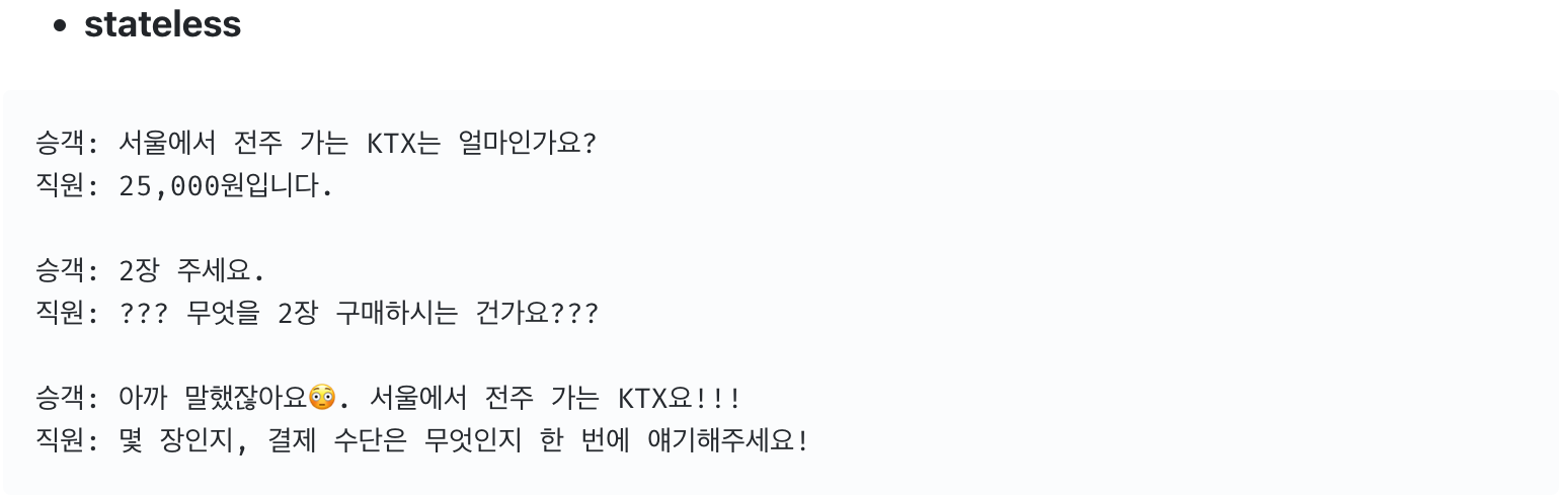하지만, stateless에서는 대화가 오고 갈 때 마다 상대는 그 문맥의 상태를 모른체 대화를 한다고 보면된다.