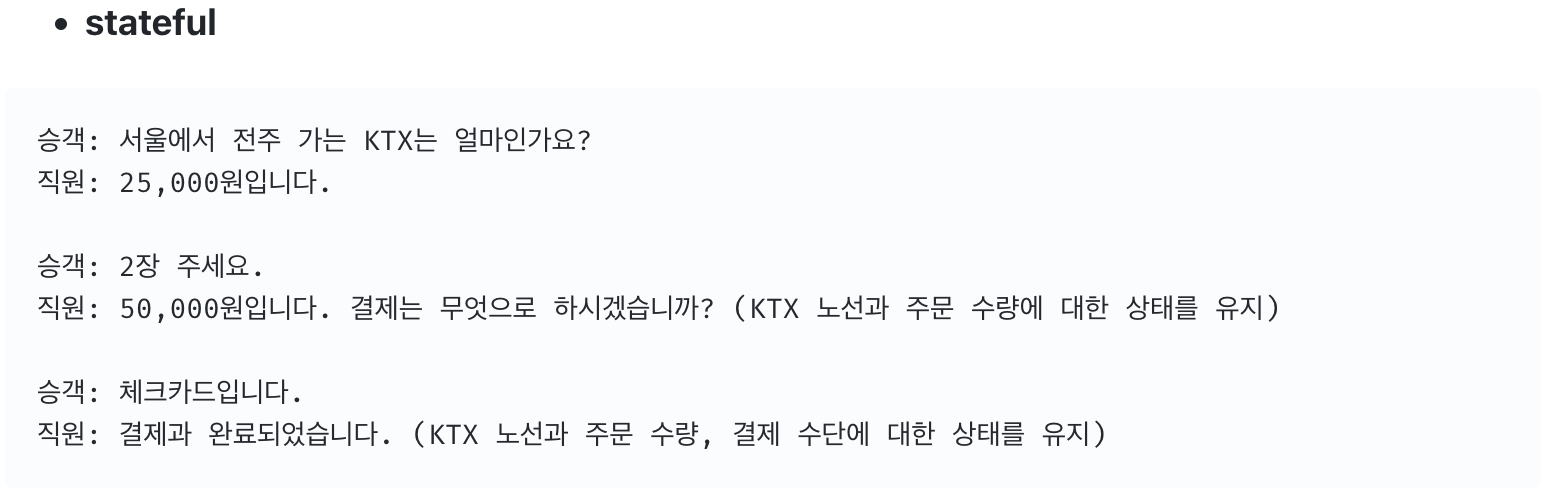 stateful은 우리의 일상 대화와 비슷하다. 대화를 주고 받을 때 마다(요청과 응답) 상대는 문맥의 상태를 유지한다.